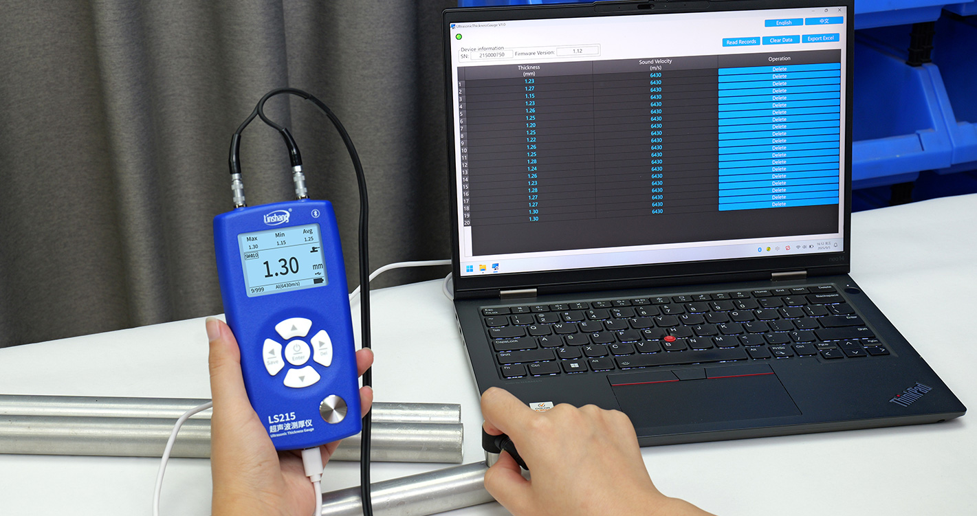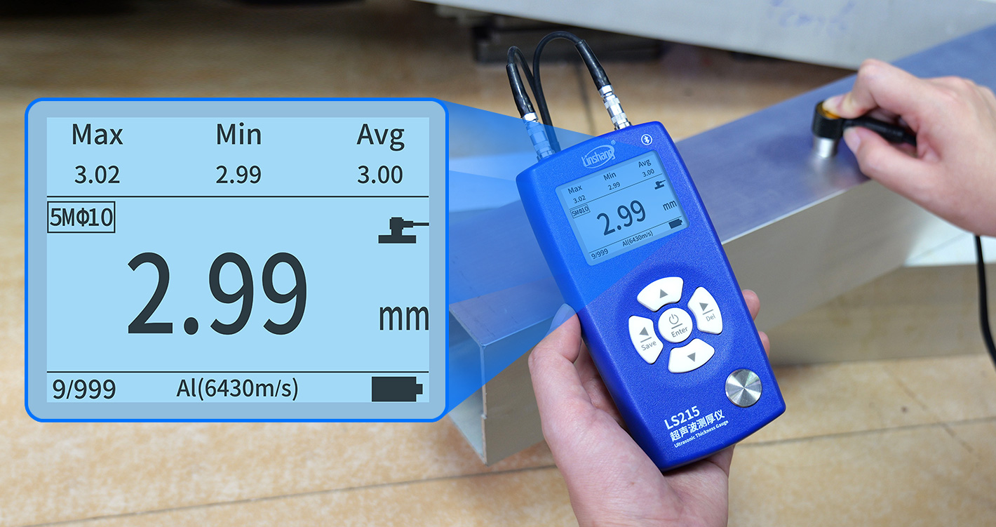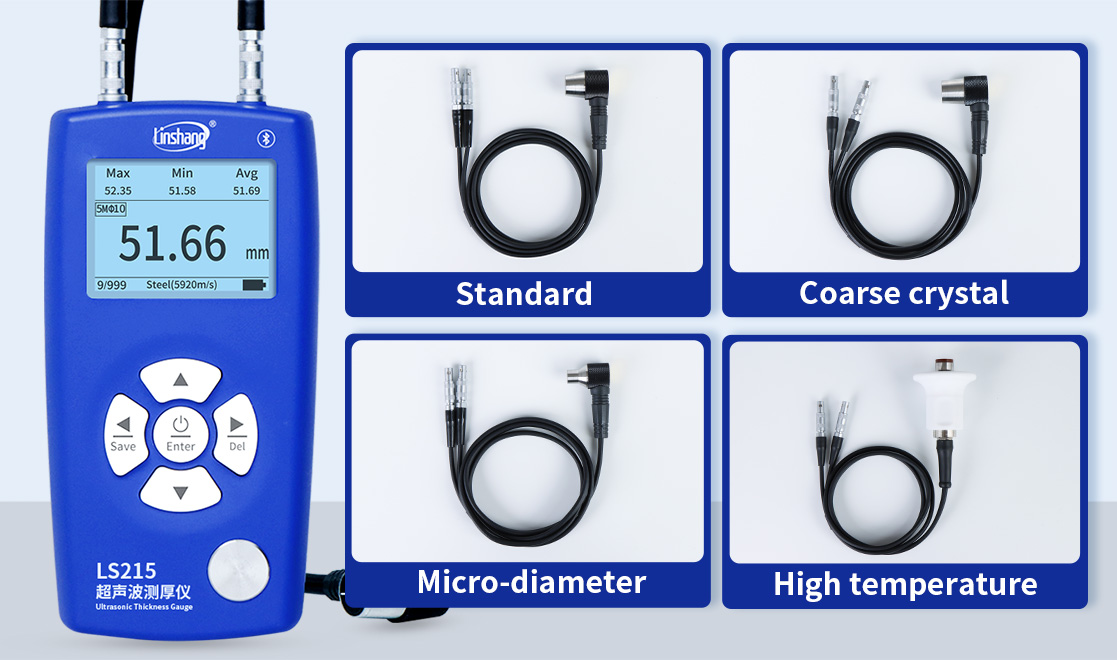 LS215 ultrasonic thickness gauge adopts the pulse echo measurement principle to perform nondestructive testing on steel, aluminum, copper, plastics, ceramics, glass, and other sound-conductive materials. With a display resolution up to 0.01 mm, the LS215 meets the accuracy requirements verified by the national metrology institute. Four probes are available—standard, micro-diameter, coarse-crystal, and high-temperature—which can be freely selected based on application needs.